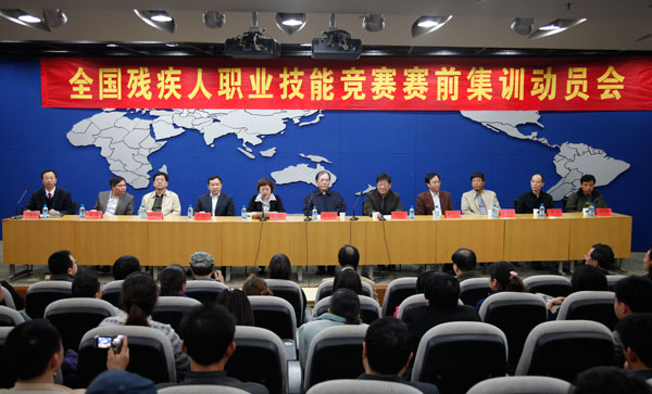 4月12日下午,第四届全国残疾人职业技能竞赛河南省代表团赛前集训动员大会在我校隆重举行。省残联副理事长董予德,我校副校长龚毅、赵继红出席大会。省残联有关部门负责人、河南职业技术学院培训中心负责人、我校承训单位和有关部门负责同志,以及指导教师代表、竞赛选手、相关工作人员共70余人参加会议。动员大会由副校长赵继红主持。