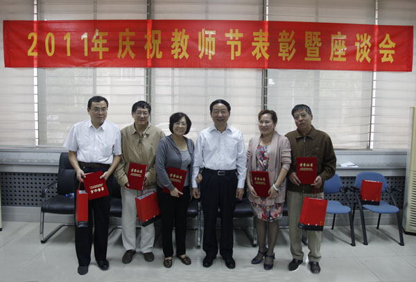 党委副书记张希凡宣读了学校《关于表彰2011年从事教育工作满三十年教职工的决定》,随后,校长剧乂文教授向获表彰的教职工代表颁发了荣誉证书和纪念品,并合影留念。