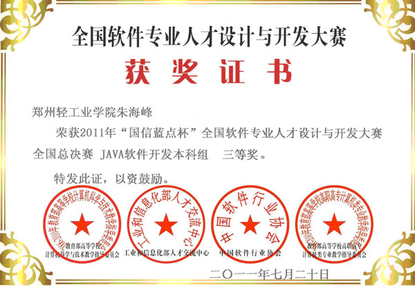 在学校的大力支持下,软件学院从3月份开始组织学生报名,并安排专业教师悉心指导,5名参赛选手在5月的河南赛区选拔赛中取得一等奖1名、二等奖1名、三等奖1名的优异成绩,其中获得一等奖的朱海峰同学代表我校参加全国总决赛并最终获奖。