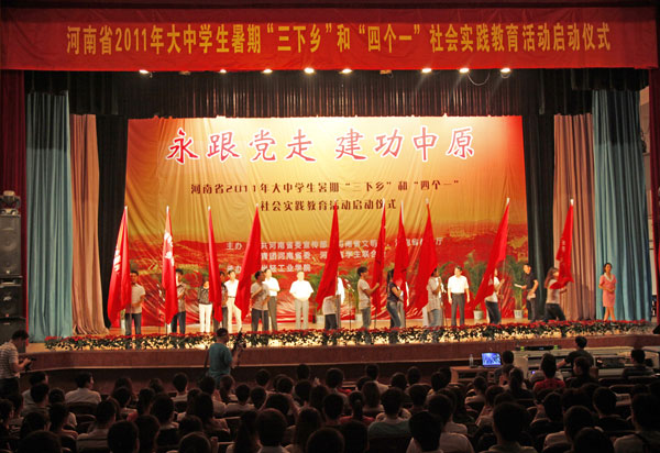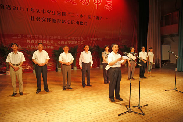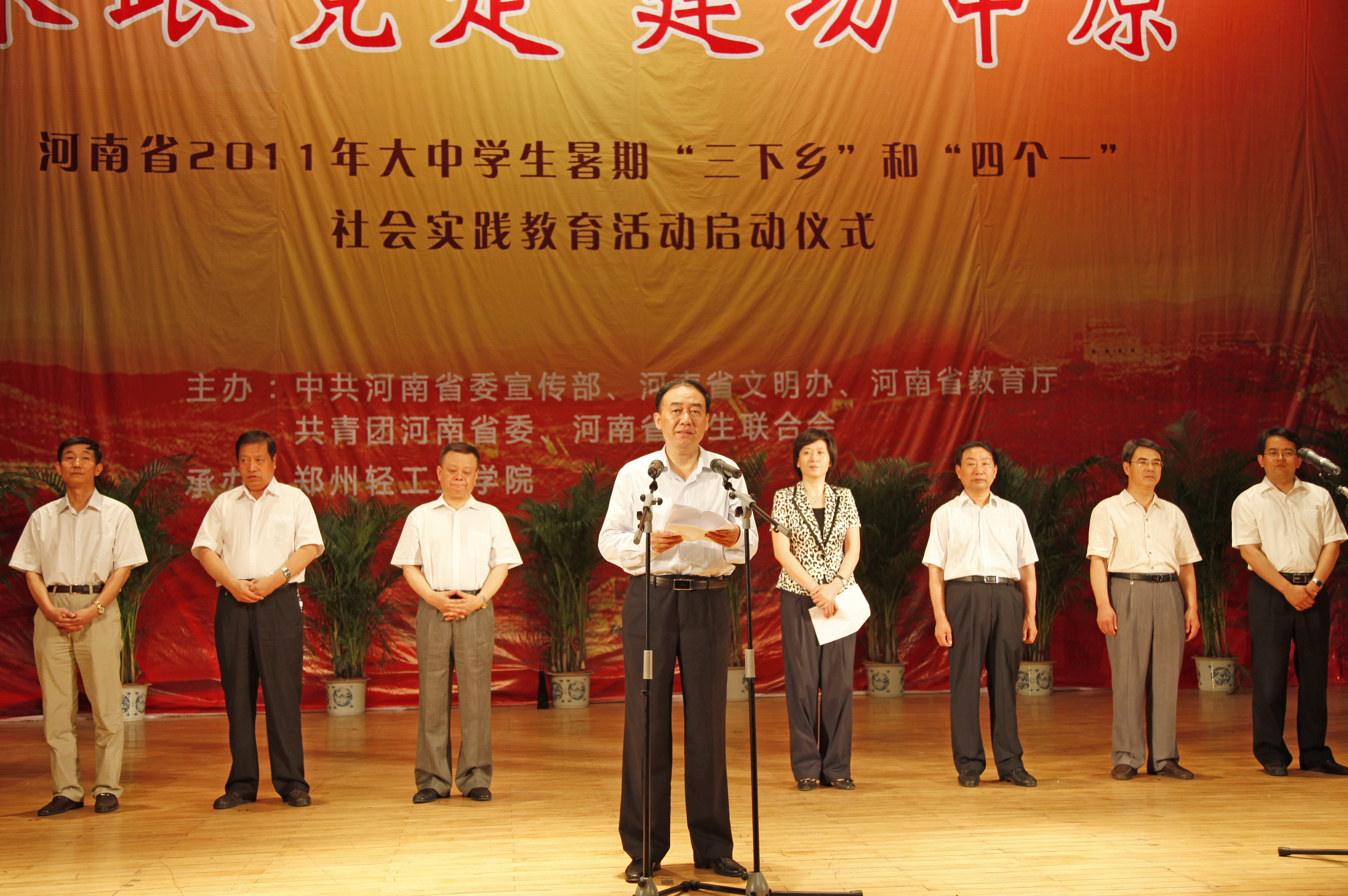 7月8日上午,由河南省委宣传部、省文明办、省教育厅、团省委和省学联共同组织的河南省2011年大学生暑期“三下乡”和“四个一”社会实践教育活动启动仪式在我校大礼堂成功举行。此次启动仪式由我校承办。