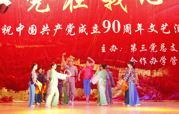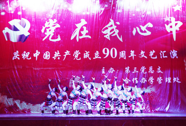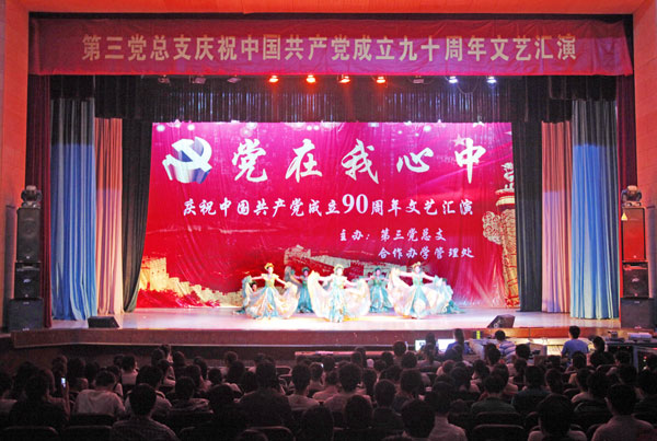 6月9日下午,第三党总支庆祝中国共产党成立90周年“党在我心中” 文艺汇演在学校大礼堂举行。党委书记林世选,副校长赵继红、安士伟出席活动,并与各合作办学单位党委书记、分管学生工作校领导、学生党支部负责人、团委及学生处负责人等一起观看了演出。