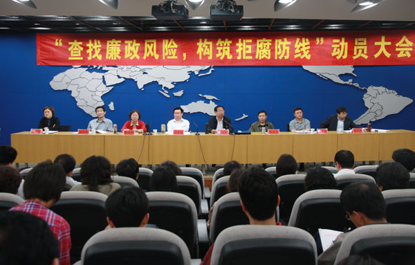 党委书记林世选就我校开展“查找廉政风险,构筑拒腐防线”活动作动员讲话。他指出,开展“查找廉政风险,构筑拒腐防线”活动,是我校今年党风廉政建设的一项重大活动,是深入贯彻落实科学发展观的必然要求,是全面推进惩治和预防腐败体系建设的重要举措,也是关心爱护党员干部的具体措施。林书记要求,广大党员干部要进一步提高思想认识,敢于将手中的权力“晒”之于众,敢于公开权力运行的每一个环节。要加大工作力度,采取有效措施,梳理岗位职责,细化工作流程,在查准、找全风险点上下功夫,在准确评估风险类型和风险等级上下功夫,在制定有效防控措施和规范管理上下功夫。要充分发挥教育的说服力、制度的约束力和监督的制衡力,建立风险防范管理的长效机制。要把本次活动的开展与落实党风廉政建设责任制结合起来,与学校中心工作结合起来,与目前正在进行的各项专项治理工作结合起来,统筹兼顾,相互促进,进一步加强制度建设,积极推进“查找廉政风险,构筑拒腐防线”活动的深入开展。