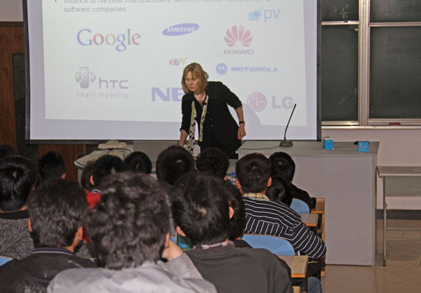 报告中,莎莉•史密斯博士深入分析了全球手机行业的巨大市场机会,并从硬件、操作系统、软件、应用程序等几方面阐述了当前手机开发的技术及趋势,比较了Apple、Android、Symbian、RIM等操作系统的各自优势和特点。随后,她结合手机行业的国际化趋势,提出可以采用本地化的开发方式去实现手机程序开发的国际化。在互动环节,莎莉•史密斯博士提问在场学生“你们最需要什么样的应用程序”,激发了同学们对手机应用程序开发的兴趣,很多同学积极发言与莎莉•史密斯博士交流自己的想法。