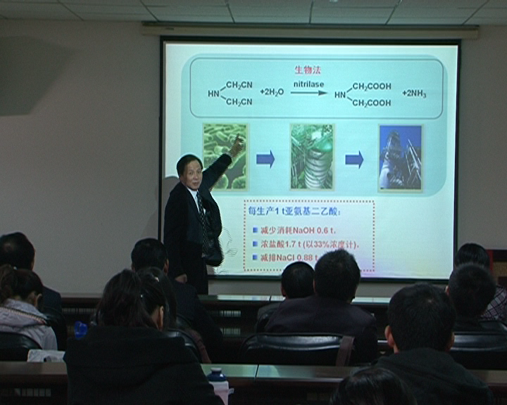 郑裕国教授重点讲述了腈转化酶在医药及中间体、农药及中间体、食品与饲料添加剂等精细化学品生产中的应用。 郑裕国教授的报告深入浅出,语言严谨、精炼,令师生们进一步了解了腈转化酶领域最新研究成果,拓宽了学术研究思路。