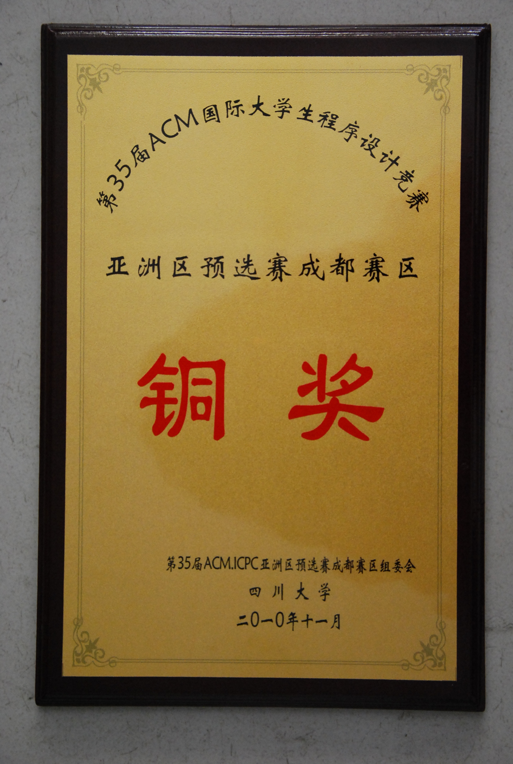 日前,第35届ACM/ICPC国际大学生程序设计竞赛亚洲区(成都赛区)的比赛落下帷幕,由我校计算机学院计算机08-1班的史佳宾、电子08-1班的李伟、计算机09-2班朱亚伟三位同学组成的我校代表队Fighting Way队奋勇拼搏,勇创佳绩,荣获铜奖。这是今年河南高校在该项赛事中的最好成绩。