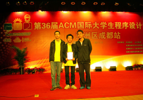ACM国际大学生程序设计竞赛(简称ACM/ICPC)是由ACM学会主办的,是世界上公认的规模最大、水平最高的国际大学生程序设计竞赛。2011年亚洲区预选赛有15个赛区,我国大陆有五个赛区,各赛区通过网络预选赛,在报名的800-1000个队伍中选130-140支队伍参加现场赛,我校在计算机与通信工程学院的朱亚伟、刘会升、娄朝阳、刘郑勇、刘兴海、刘超等6名同学交叉组队,在网络预选赛中成绩优异,随后参加了北京、成都、福州三个分赛区的现场赛并获得3项铜奖。