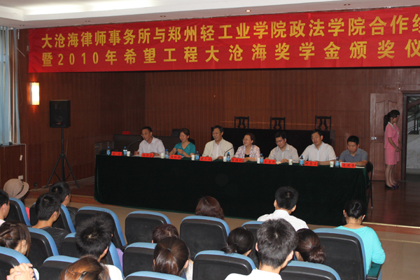 5月27日下午,我校政法学院与大沧海律师事务所合作续约暨2010年希望工程大沧海奖学金颁奖仪式在政法学院模拟法庭顺利举行。党委副书记张胜利出席并讲话。大沧海律师事务所所长袁二方、河南省希望工程办公室承东升应邀出席。相关职能部门和院系负责同志及法政系部分师生参加颁奖仪式。