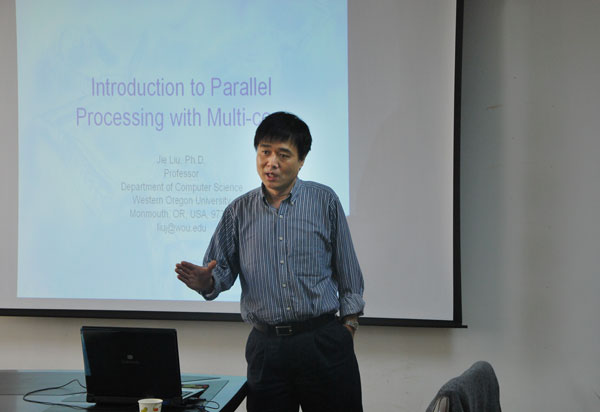 4月1日上午,美国西俄勒冈大学刘杰教授应邀来校讲学,在东五楼学术交流室做了“多核并行处理计算”的报告。