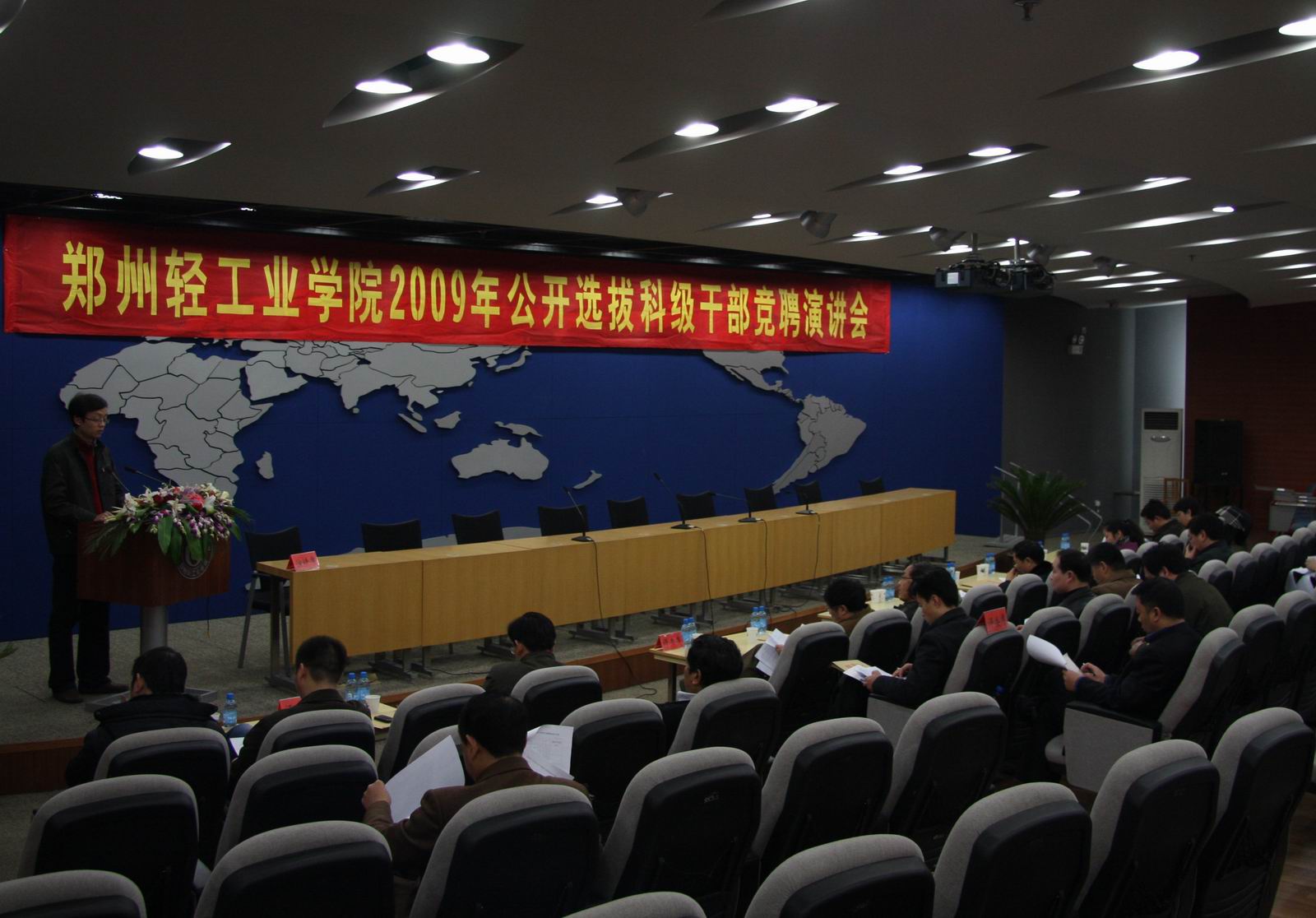 按照《郑州轻工业学院2009年部分科级职位公开竞岗实施方案》规定的程序,从11月23日始,经宣传发动、公开报名,资格审查、张榜公布,全校共有76人符合竞岗资格条件。演讲会上,76名竞岗干部按照公布的岗位和每个岗位的抽签顺序,从各自的基本情况、工作思路和设想等方面在规定的时间内进行了演讲。评委会根据竞岗者的任职优势、工作思路、语言表达等情况进行了综合打分。