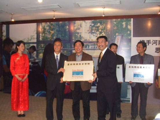 2006年4月13日,“携手河南高校创新网络技能教育――思科网络技术学院授牌仪式”在郑州索菲特国际饭店隆重举行,省人大副主任贾连朝、信息产业厅厅长苏福功、信息产业厅副厅长张振宇、教育厅副厅长崔丙建、思科公司副总裁、中国区总裁林正刚、思科中国副总裁吴世楷等领导出席会议。