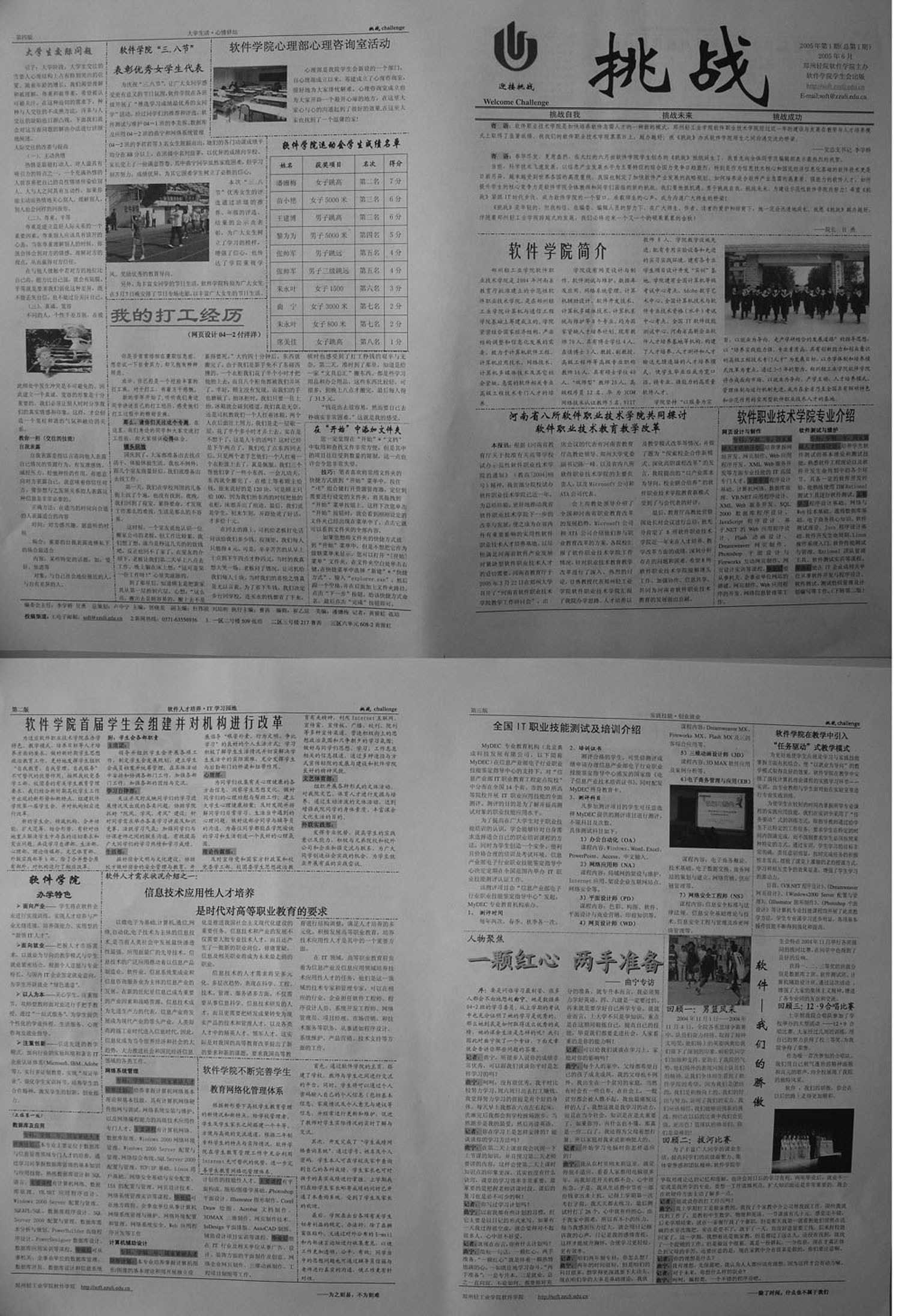 为向广大师生宣传介绍软件学院的建设与发展,了解软件学院在管理模式、人才培养、教学模式、实践与创新、就业与创业等方面的特色,展现软件学院学生良好的精神面貌,为同学们提供一个交流与沟通的媒介,经过前期广泛调查和征求意见,软件学院于2005年6月推出了学生刊物《挑战》首期报纸。