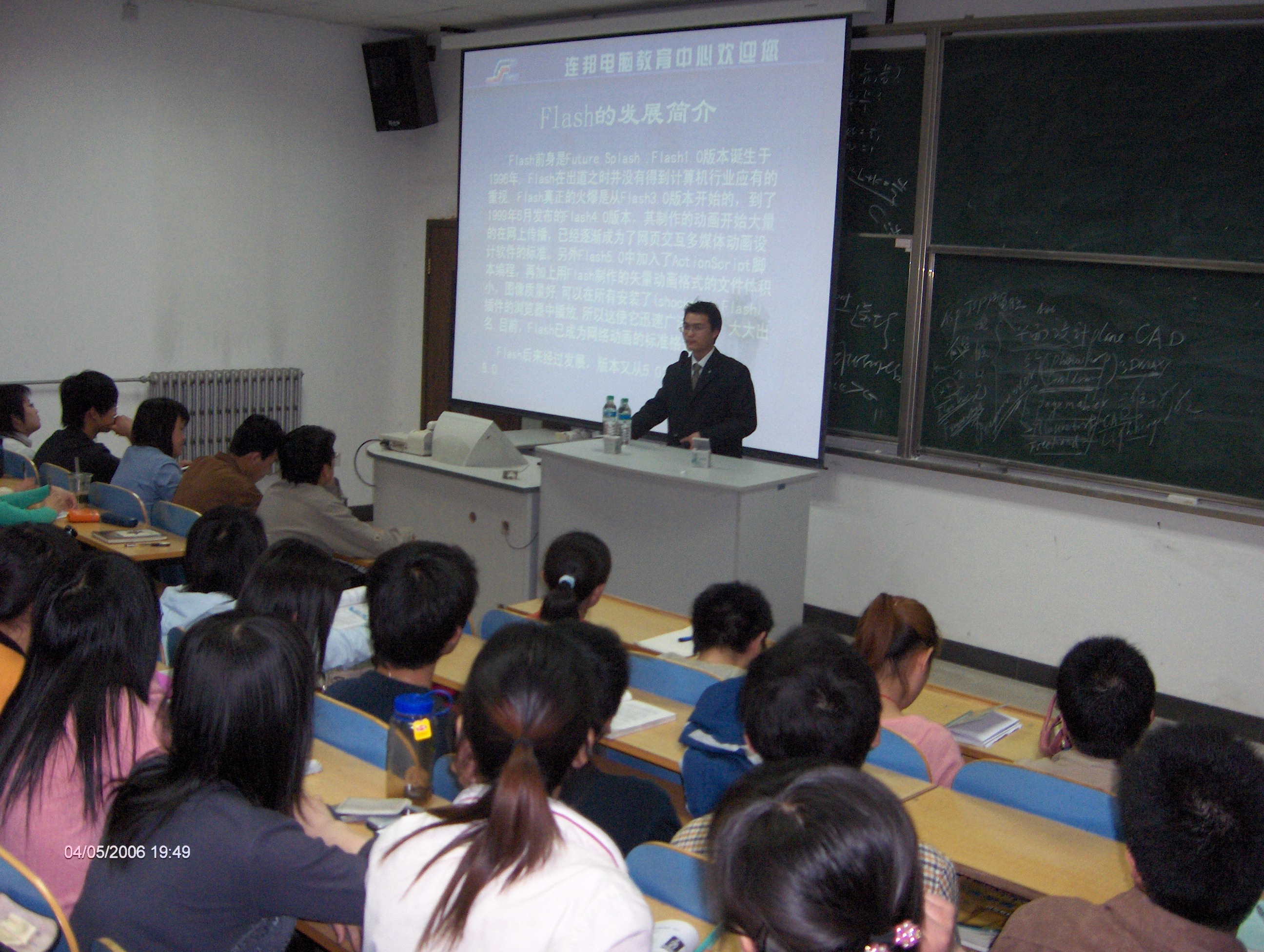 2006年4月6日晚7:30�D�D9:30,连邦电脑教育中心高级讲师举办了第一次讲座,并受到了广大学生的积极参与。此次讲座针对平面设计和Flash动画的简单制作做了详细介绍,并让听讲座的同学进行上机实践。理论与实践相结合,使得在场的每位同学都有很大的收获,不仅在电脑制作方面有了新的认识,对于平面设计和装饰设计软件的学习也有了更深一步的了解。