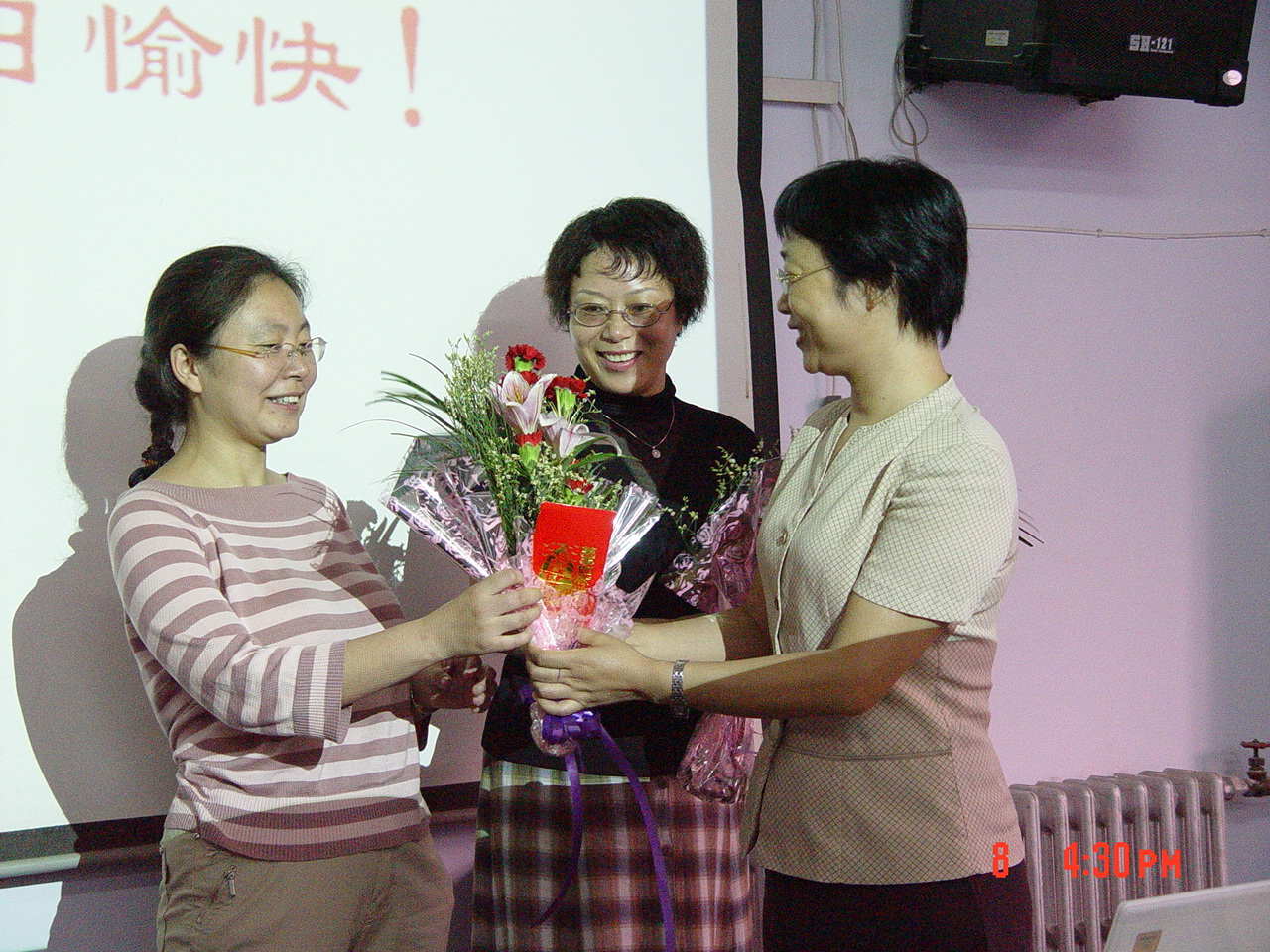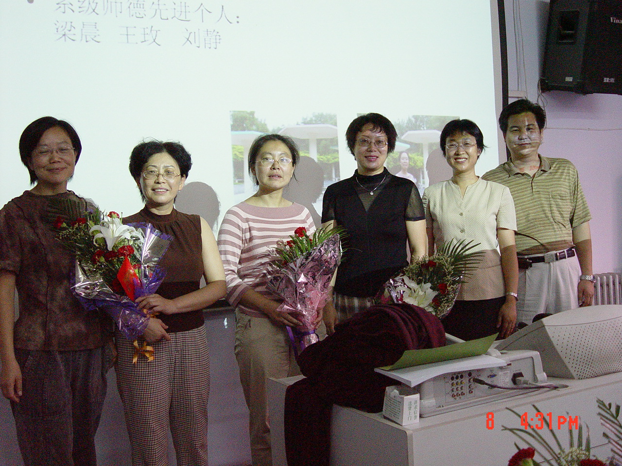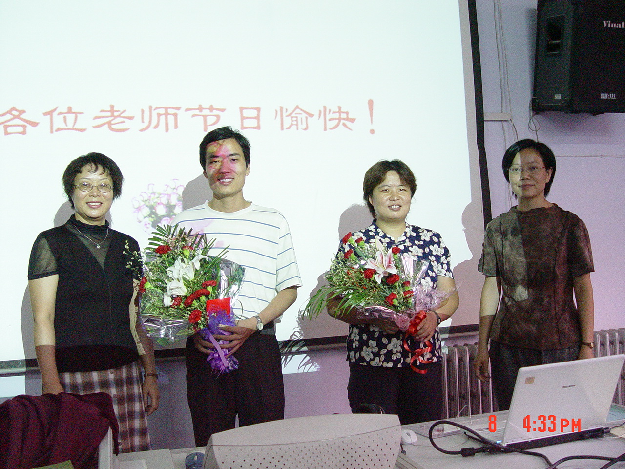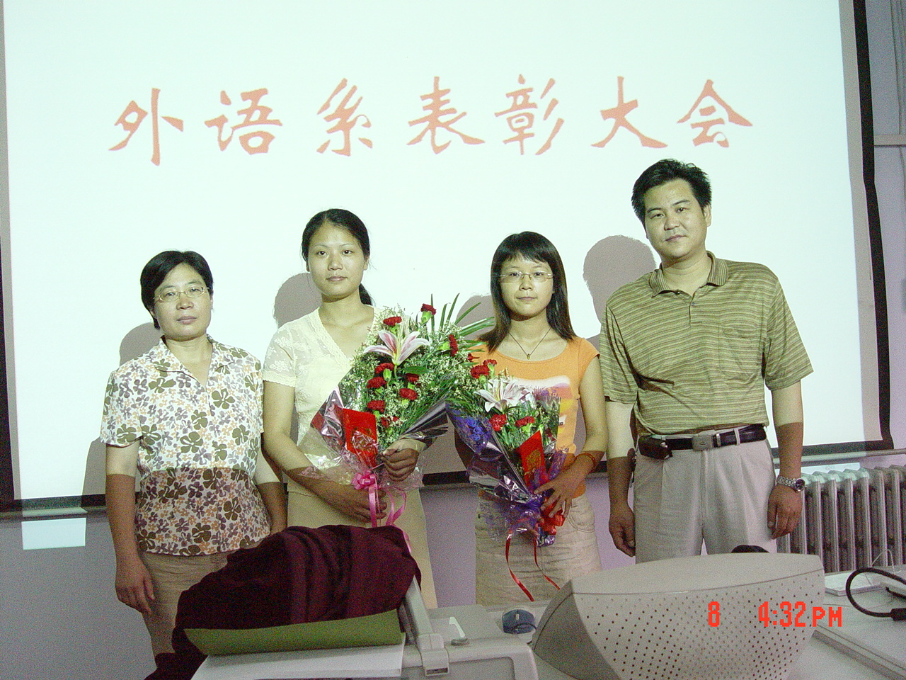 9月8日下午4:30分,外语系全体教工欢聚一堂,在充满欢乐、祥和的气氛中欢渡自己的节日! 紧接着,又对3位系级师德先进个人和10位评估工作先进个人进行了表彰。13位或奖个人上台领奖,系领导为他们颁发了奖金并和或奖人员合影留念。 最后,陈淑萍主任总结发言。她首先代表系党政向全体教工祝福节日快乐,然后对或奖人员表示祝贺,对前段工作特别是评估工作进行了回顾和总结,充分肯定了大家的工作,并对下一步评估工作提出了要求。