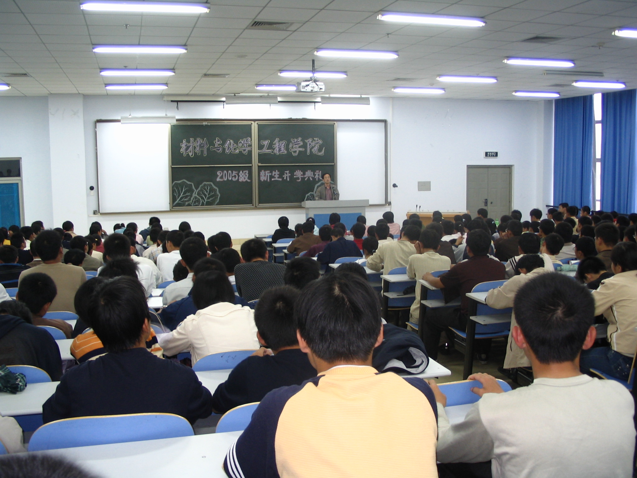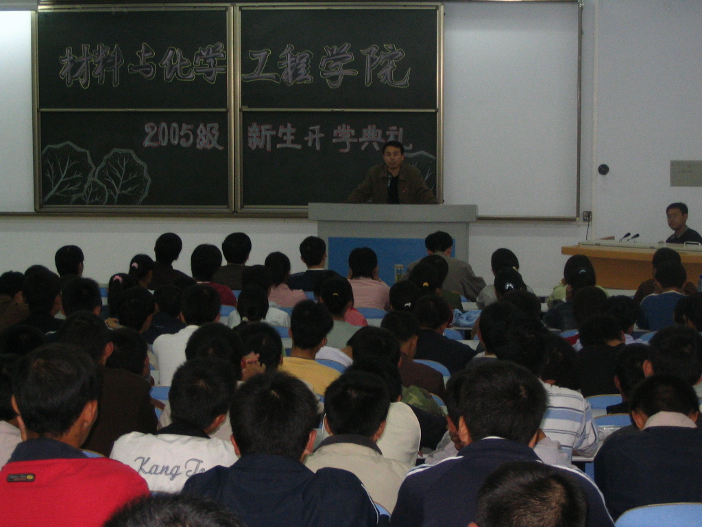 2005年9月28日下午2:30,材料与化学工程学院2005级新生开学典礼在教三楼303教室隆重举行,会议由分团委闫福丰老师主持,出席大会的领导老师有材料与化学工程学院院长方少明教授、党总支书记戚俊清教授、党总支副书记王林焕副教授、副院长许培援教授、副院长王军教授、材料科学工程系系主任陈志军教授及各年级辅导员老师。