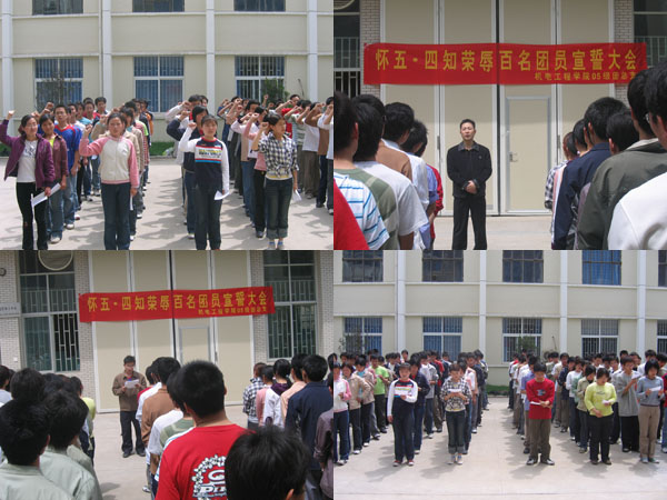 时值五・四前夕,4月26日中午13:00,为纪念五・四运动87周年,在广大团员青年中弘扬五・四精神,教育广大青年牢固树立和实践社会主义荣辱观,机电工程学院2005级团总支积极响应分团委号召,在西三楼南广场组织召开了“怀五四、知荣辱”百名团员宣誓大会。机电工程学院受到表彰的2005-2006年度“优秀团干”、“优秀团员”以及分团委各部成员逾百人参加了大会。大会由2005级团总支组织委员段士川同学主持。