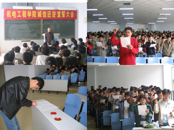 为了帮助学生树立诚信还贷意识,引导学生自觉成为思想境界高尚的人和明礼诚信的人,机电工程学院于4月5日中午13:00在教三楼203教室举行了诚信还贷宣誓大会。机电工程学院学生工作领导小组成员、学生辅导员及全体申请国家助学贷款学生参加了大会。