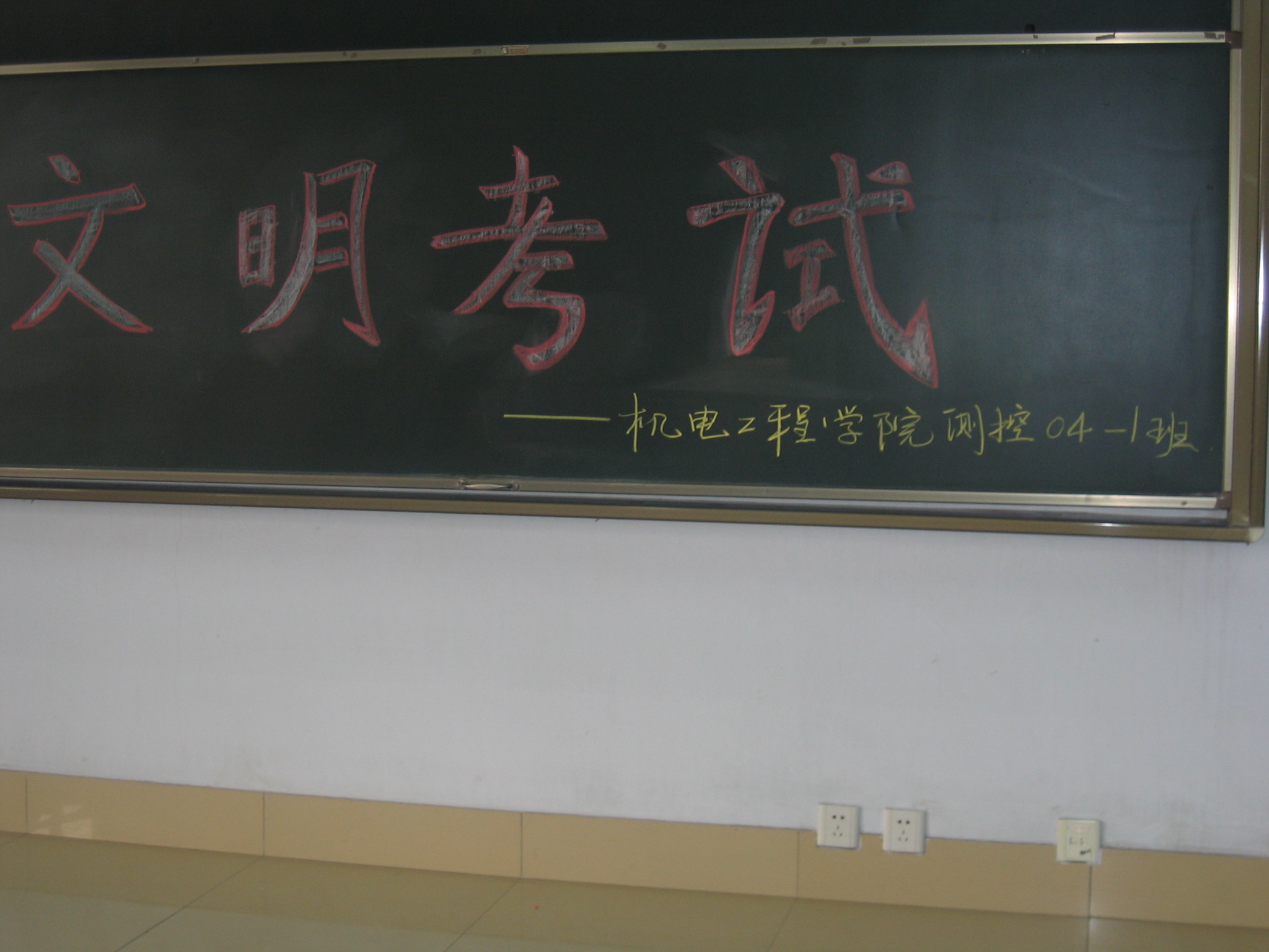 在今天的考试中,机电工程学院各考场都书写了“诚信考试,坦荡做人”、“做文明考生,交真实答卷”等宣传标语,并编排了考场座次表;考前各班都认真清理了考场地面、桌斗、桌面卫生;考场内学生的书包等物品在指定位置摆放整齐。各考场秩序井然,考生状态良好。