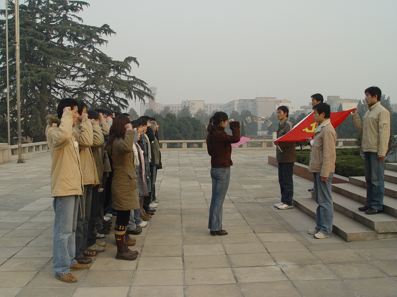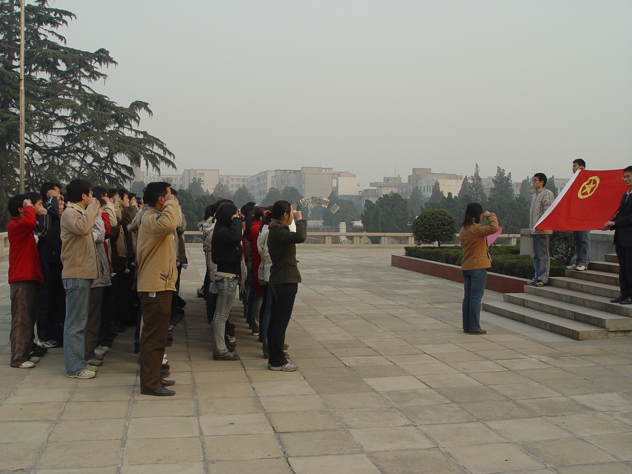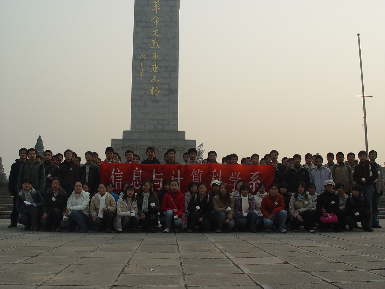为了纪念“一二.九”运动70周年,抗日战争暨世界反法西斯战争胜利六十周年,弘扬爱国主义精神,激发爱国热情,促进校园精神文明建设,信息与计算科学系于12月8号下午组织学生党员及广大优秀团员祭扫烈士陵园,凭吊革命先烈。活动中,学生代表向烈士们敬献花篮,全体同学向革命烈士致敬默哀。学生党员向党旗宣誓,重温入党誓词;团员向团旗宣誓,升华对共青团的热爱之情。分团委张辉老师要求广大同学继承“一二九”运动爱国进步、追求真理的精神,努力学习,积极进取,不断创新,为祖国建设做出自己的贡献。学生代表在英雄纪念碑前发言,立志完成时代赋予我们的历史使命。