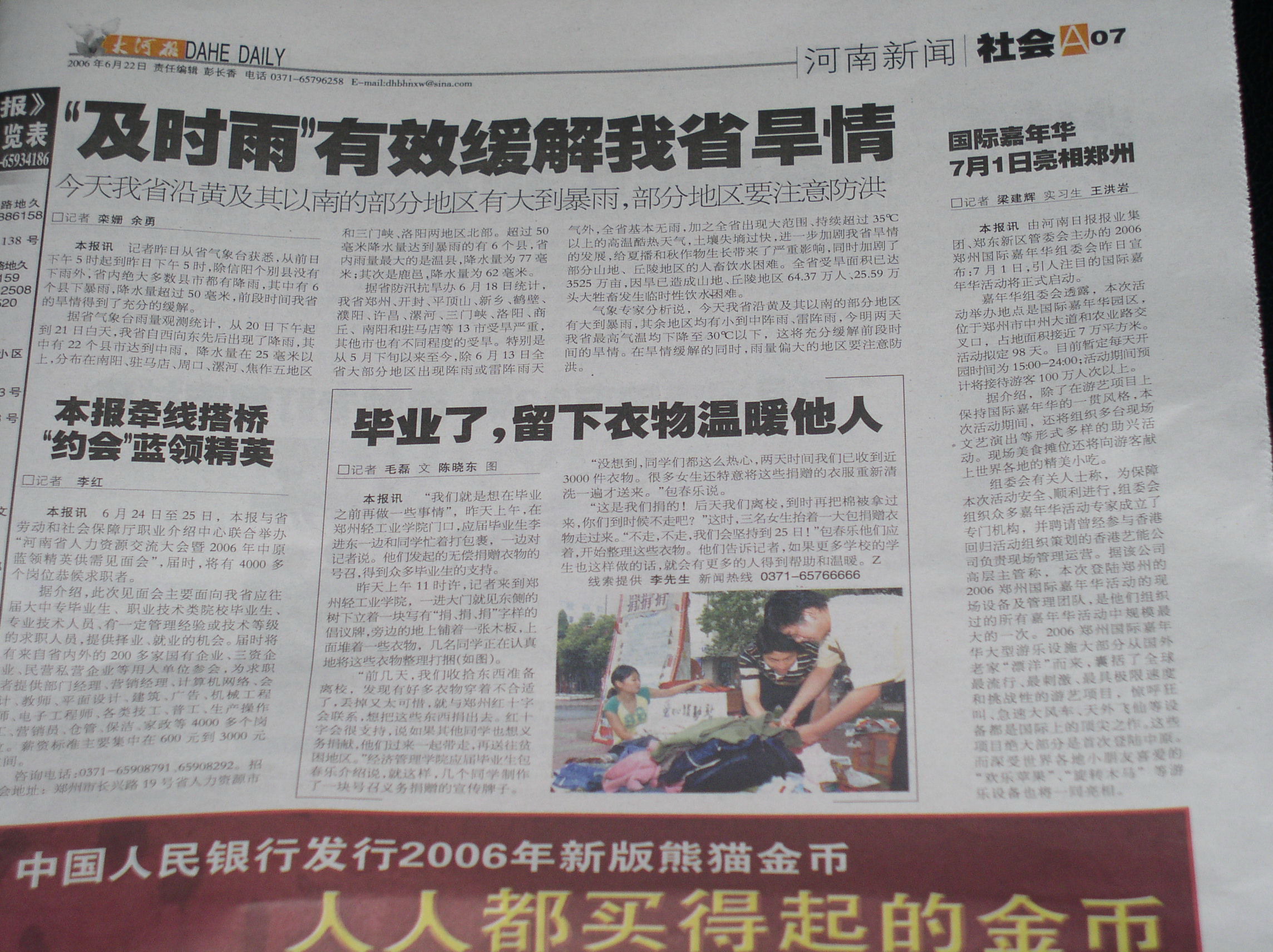 6月22日,《大河报》(河南新闻社会07版)以“毕业了,留下衣物温暖他人”为题报道了我校毕业生爱心捐赠活动。