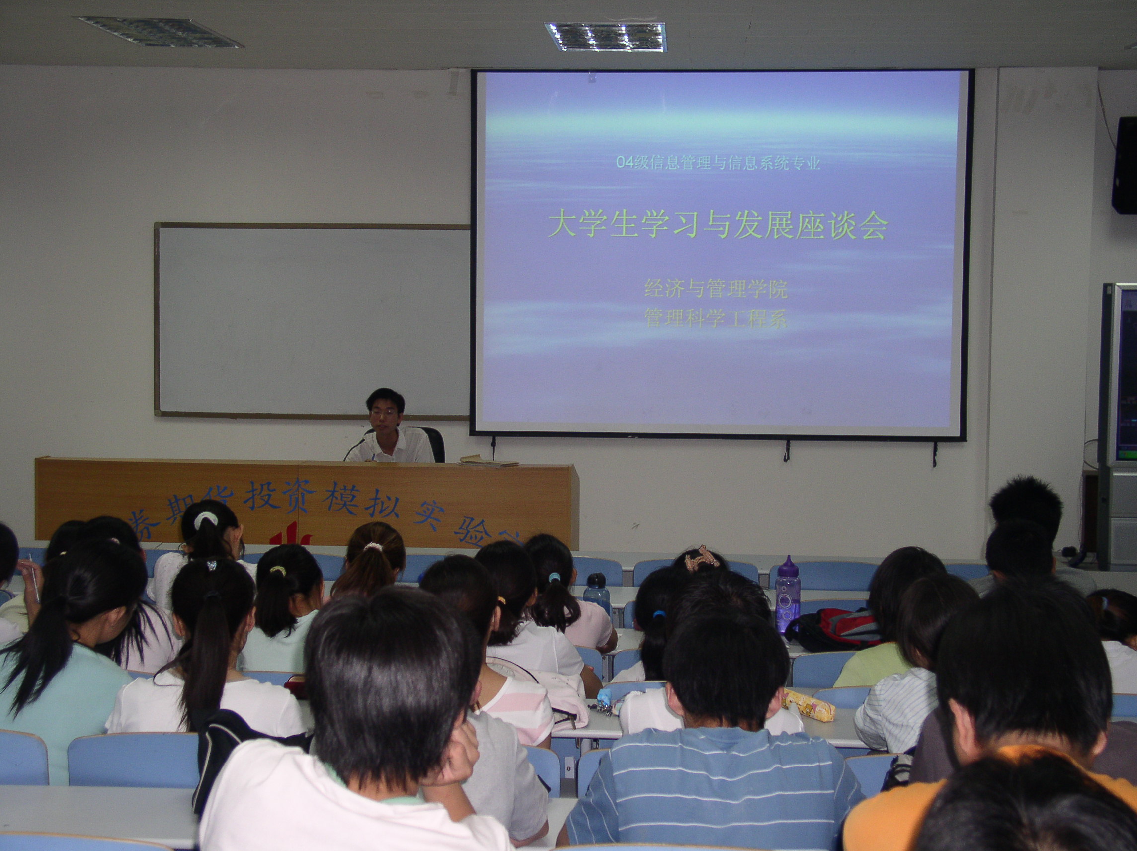经管学院党总支书记韩庆林教授首先对大学生的学习和就业现状作了深入分析,对信管专业学生的考研问题进行了分析和指导,为我院2004级信管专业学生今后的大学生活如何正确学习提供了帮助。即将参加工作的2002级信管专业毕业生代表李黄河就同学们关心的职业技能问题和执业资格证的考取问题作了详细的解释,为信管专业学生的就业又增添了新的砝码。我院2004级信管专业的学生还就自己在学习过程中所遇到的疑问,积极向在场的老师提问,老师都耐心地给予了一一回答。