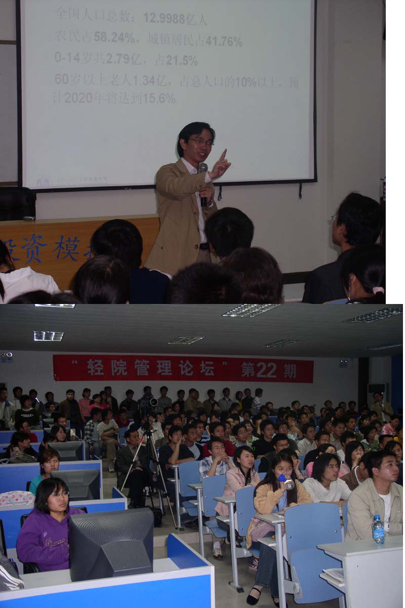 吴先生报告的题目是“解读大陆营销”。他结合营销理论知识和自身实践,从大陆企业营销背景出发,就企业营销环境变化、营销理念、营销策略、增强品牌意识、产品流通渠道方式等几个方面进行了深入浅出的分析,并结合自身实践对当前一些品牌产品的营销模式等作了详细的讲解和分析。然后,他对同学们提出的问题作了一一解答。 吴先生作为著名品牌雅士利的营销总监,理论知识和实践经验都十分丰富,演讲精彩纷呈,引人入胜,博得广大师生的阵阵掌声。最后,经管学院副院长管洲副教授为吴先生作了精彩点评。