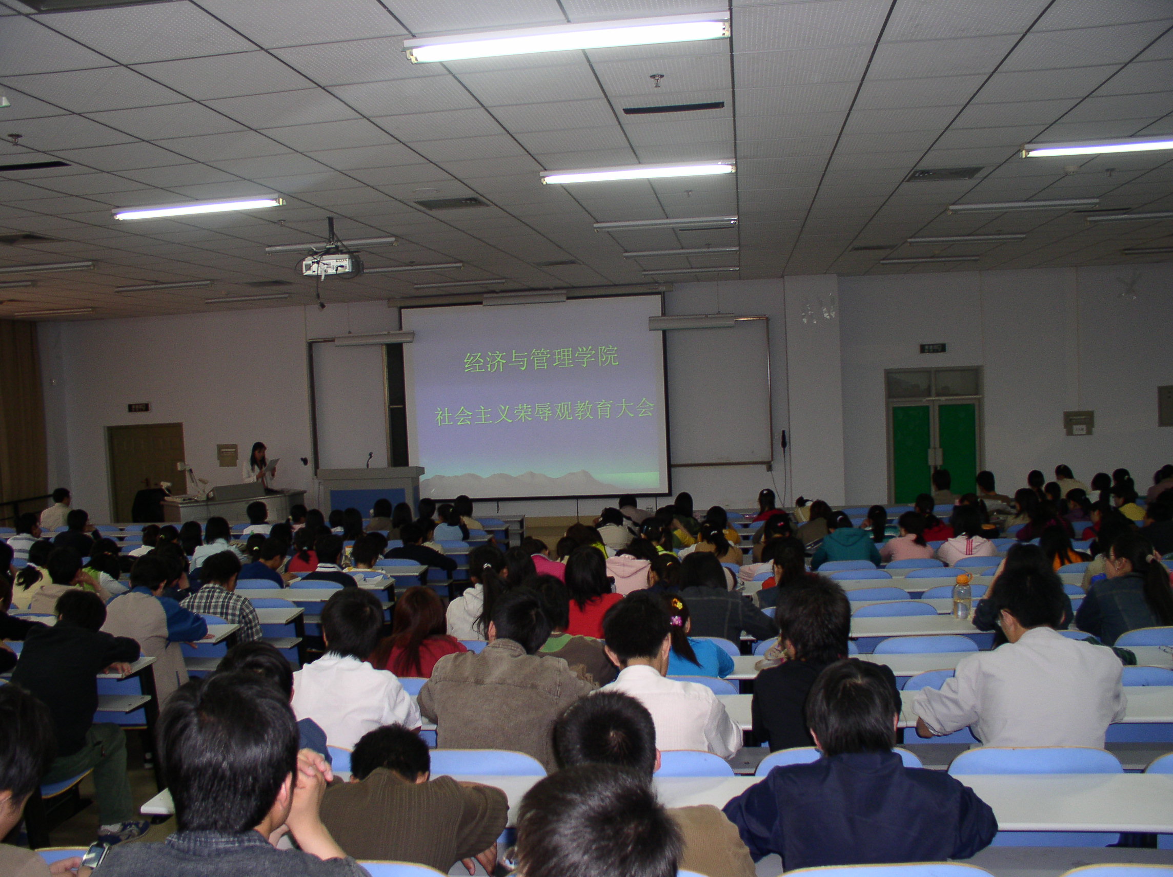4月6日下午17:30,经管学院组织师生四百余人在教三楼302开展了以“知荣辱 辨善恶 培养大学生社会主义新风尚”为主题的社会主义荣辱观教育大会。