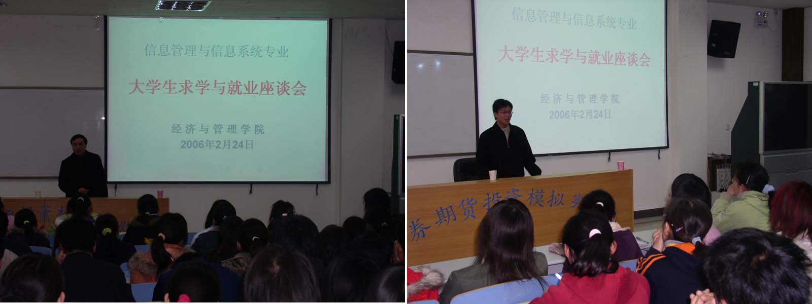 为进一步端正学习目的,指导学生做好职业生涯规划,2006年2月24日,经管学院举办信息管理与信息系统专业大学生求学与就业座谈会,信管专业部分02级毕业生与该专业03、04、05学生进行了就学习、职业生涯规划与就业等热点问题进行了座谈。座谈会气氛热烈,效果很好。 &nbs" />