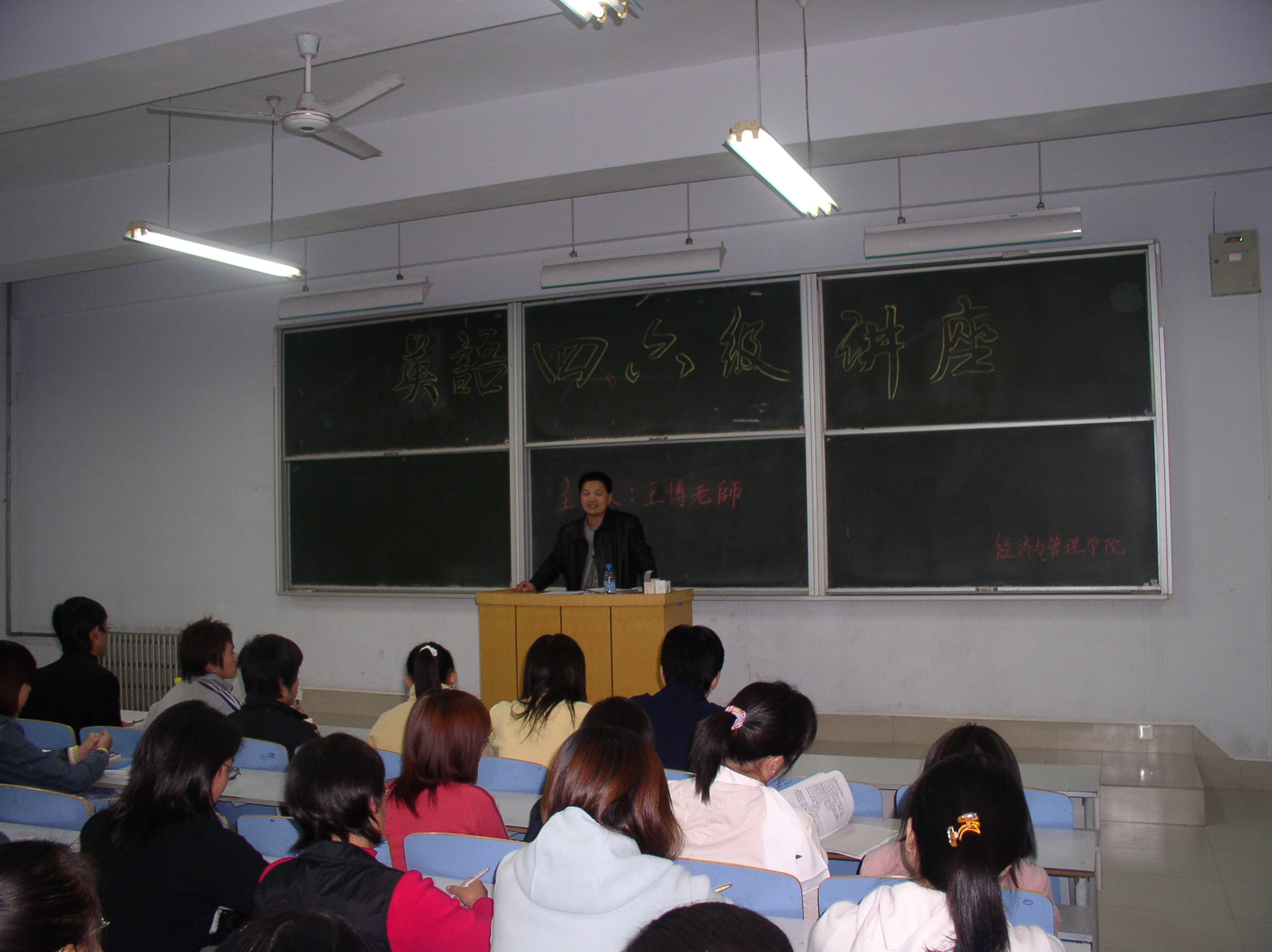 为了提高同学们的英语水平,营造良好的英语学习氛围,提高同学们的英语四、六级应试技巧,经管学院邀请外语系王博老师于10月22日晚上7:00在东一楼200为广大同学做了一场精彩的英语四、六级讲座。