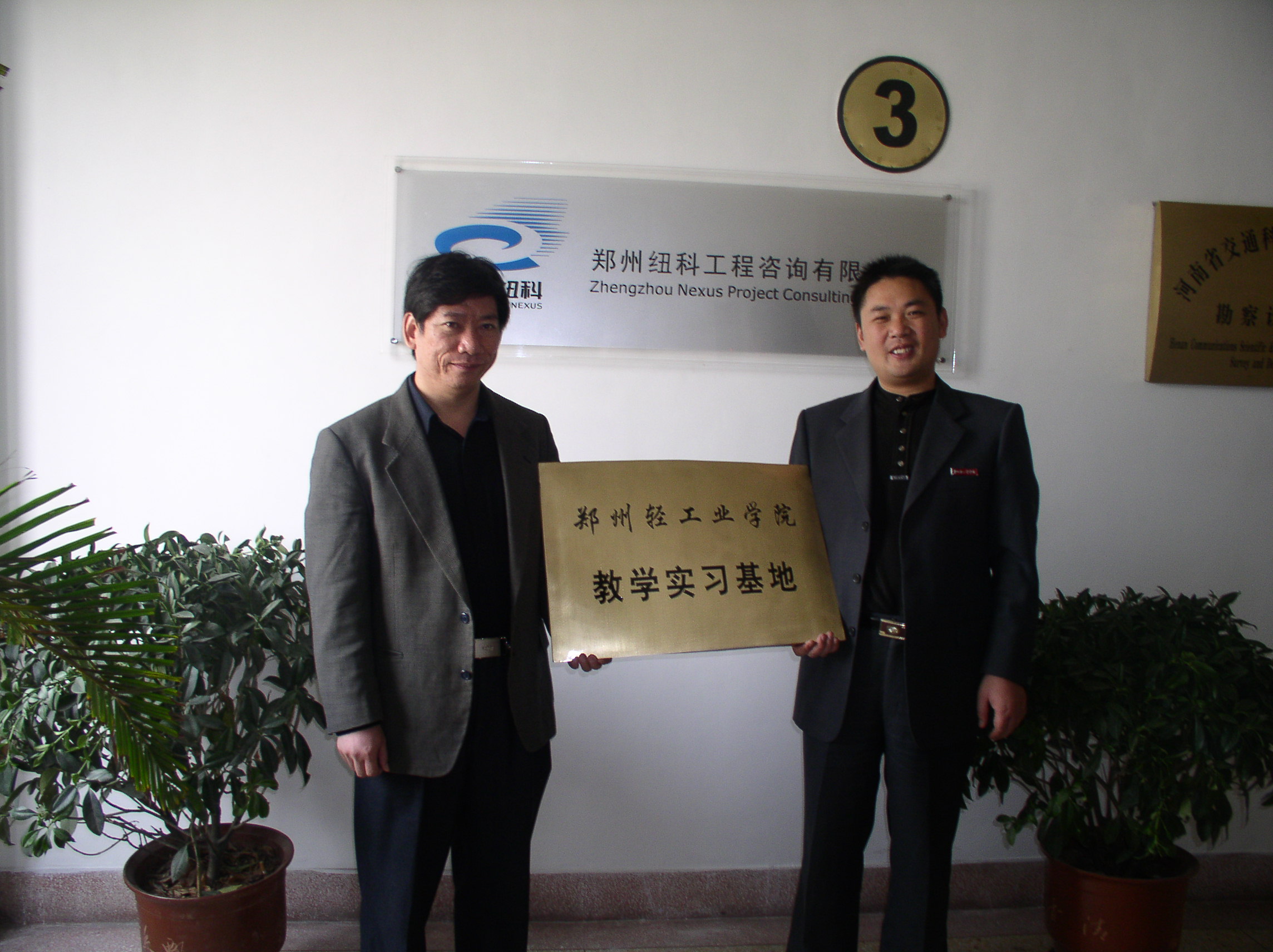 近几年来,郑州轻工业学院经济与管理学院与郑州纽科工程咨询有限公司不断加强交流与合作,每年都派学生到该公司实习,并有部分实习的学生被留在公司工作,极大地提高了学生将理论运用于社会实践的能力。经过我院领导与郑州纽科工程咨询有限公司领导的磋商,一致同意将郑州纽科工程咨询有限公司作为郑州轻工业学院教学实习基地,并于2005年10月17日在该公司举行了“郑州轻工业学院教学实习基地”挂牌仪式。郑州轻工业学院经济与管理学院周广亮副院长和郑州纽科工程咨询有限公司董事长吴福生先生参加了挂牌仪式活动。