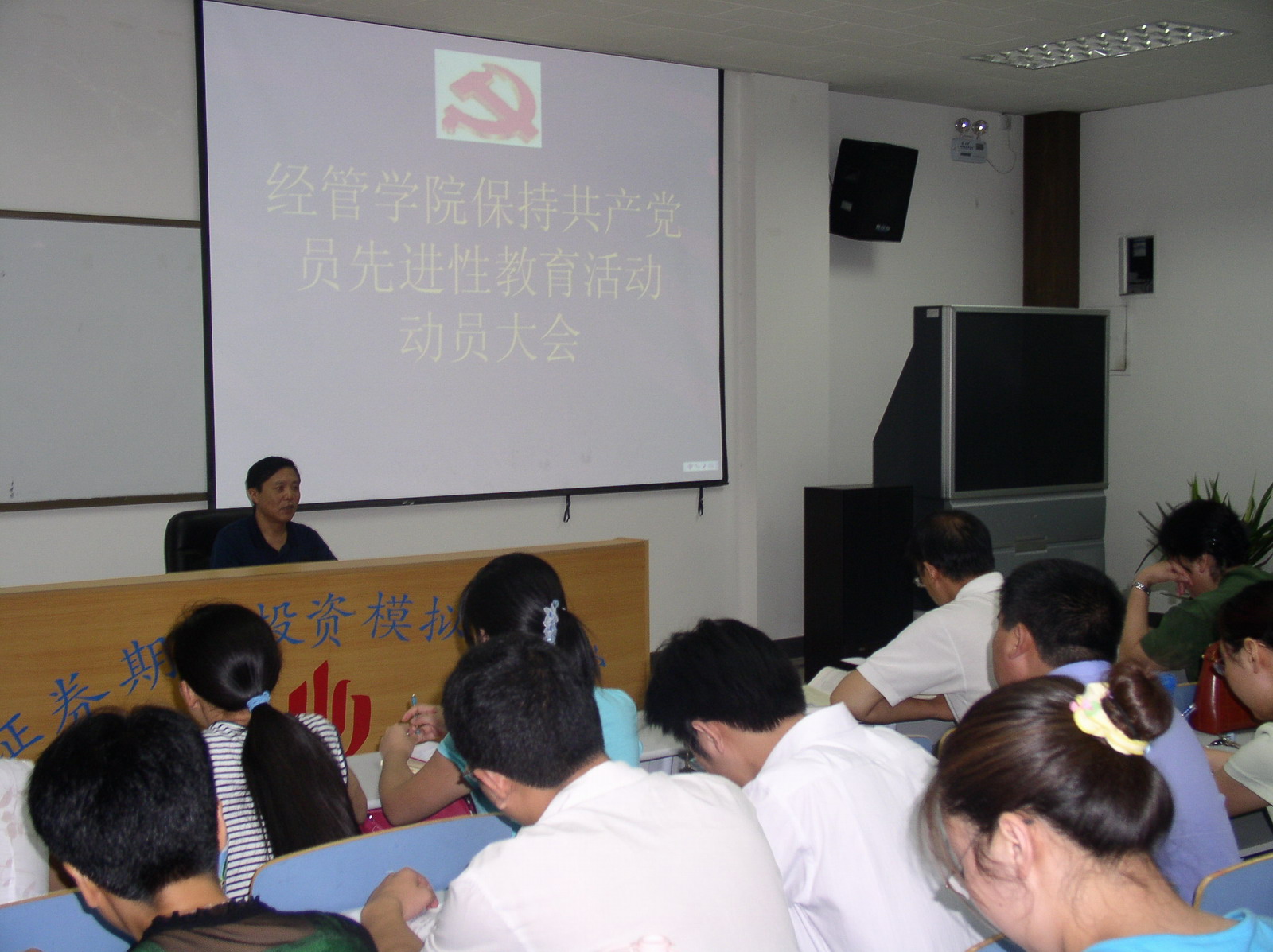 党总支副书记于善启同志传达了《郑州轻工业学院保持共产党员先进性教育活动实施方案》,并部署了经管学院具体活动安排。最后强调了对学生党员学习阶段的具体安排和要求。