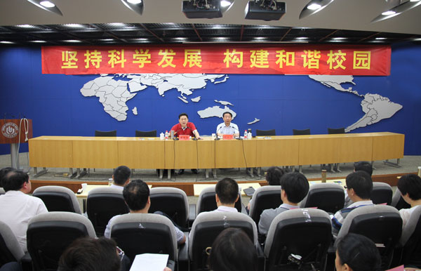 6月15日上午,中共河南省委委员、河南省人民检察院常务副检察长张国臣莅临我校,在图书馆报告厅做题为“坚持科学发展 构建和谐社会”的主题辅导报告。党委书记、校长剧乂文主持报告会。校领导张胜利、窦效民、龚毅、陈江风、吕彦力、安士伟、李世瑛出席报告会。全体中层干部、校纪委委员、各党总支纪检委员、机关科级以上干部、各院(系)党政办主任,以及人事、财务、后勤、基建、设备、招生等职能部门全体工作人员现场聆听了报告会。
