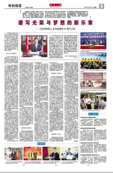 6月6日,我校建校35周年庆典前夕,《河南日报》第5版以特别报道的形式整版刊发了展示我校建校35年来建设发展成就的稿件《谱写光荣与梦想的新乐章――写在郑州轻工业学院建校35周年之际》。