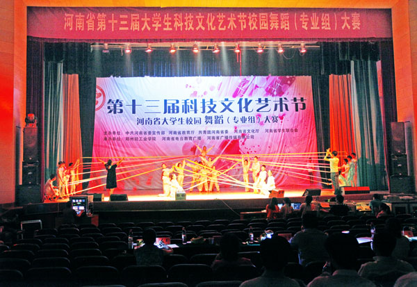 6月2日,河南省第十三届大学生科技文化艺术节专业组校园舞蹈大赛在我校东风校区大礼堂成功举行。来自全省31所高校的57支队伍1500余名大学生参加了大赛,也为我校师生带来了一次难得的现场观赏和交流学习的机会。