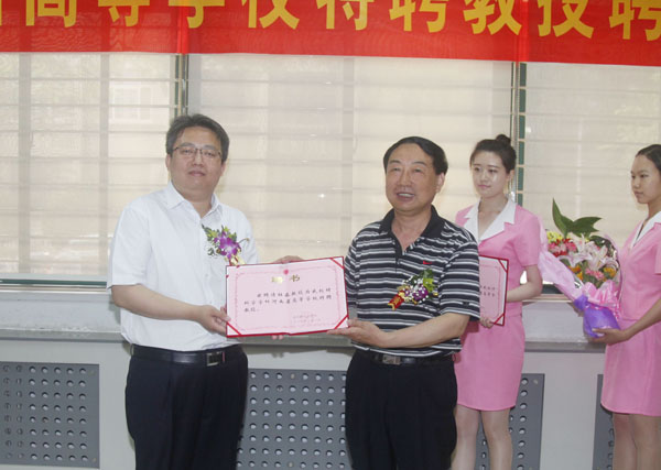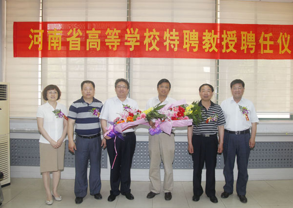 党委书记、校长剧乂文教授为两位省级特聘教授颁发聘书并发表讲话。剧书记指出,近年来,学校抓住国家促进高等教育大发展的良好机遇,实施人才强校战略,实现了办学规模和办学层次的跨越式发展,在人才培养、学科建设、科学研究、人才队伍、合作交流、服务社会等方面取得了显著的成绩,学校正以此为契机,深入贯彻落实省九次党代会和卢展工书记关于做好高等教育工作的重要讲话精神,主动适应中原经济区建设需求和行业发展需求,发挥自身优势,坚持特色发展,全面加快特色明显、优势突出教学研究型大学的建设步伐。他强调,学校始终高度重视特聘教授工作,充分发挥省级特聘教授在学科建设、人才培养、重大项目研发等方面的作用,已受聘的几位特聘教授在学科建设、科学研究、人才梯队培养等方面取得了一定的成绩,为学校的发展做出了贡献。他表示,两位教授的到来,将对我校相关学科起到有力的推动作用,对学术队伍的培养、科研成果的创新、学科实力的提升起到重要的引领和促进作用。他要求相关院系和职能部门充分利用这次机会,培育学术梯队,提高学科建设层次;同时要尽一切努力做好服务工作,为杜淼教授、黄德强教授提供良好的工作条件和生活环境。