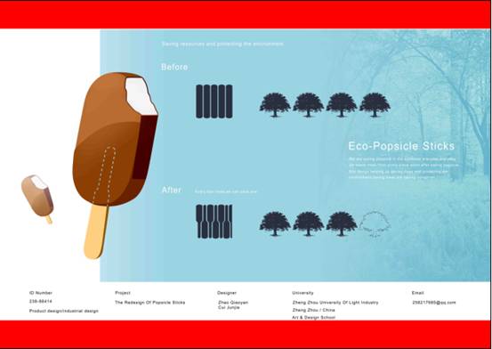 《Eco Popsicle Sticks》作品介绍:该设计针对人们日常消费的冰棒棍进行了新的思考,即在不影响已有的人机关系的基础上(人们手持冰棒棍的习惯和舒适性),通过对一整块木料上的重新分割来增加材料的使用数量,从而减少人类对于自然环境的压力。