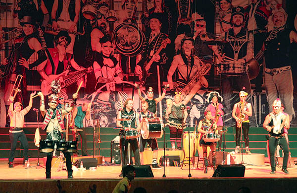 演出在别开生面的出场仪式中拉开帷幕,艺术家们在演奏乐曲的同时从礼堂入口沿观众通道列队登上舞台。在随后的演出中,他们先后表演了《空洞》、《火球》、《努力奋斗》、《五月之歌》等17个节目。乐团创造性地将杂技、高跷、呼啦圈等表演形式巧妙地融入音乐演奏之中,用肢体传达音乐的律动,节目精彩纷呈。铿锵有力的摇滚节奏、激情四溢的演出风格一次次地将全场的气氛推向高潮,场内观众不断随着音乐节奏合拍击掌,与乐队交流互动,气氛热烈。在演出的末段,演出进入最高潮,受乐团之邀,全体观众起立,随着明快的音乐节奏摇摆舞动,现场一片沸腾。