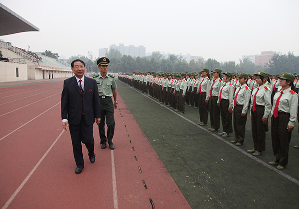 党委书记剧乂文接受军训总指挥的报告,发布命令:“开始!”雄壮的军乐声响起,剧乂文书记在承训部队首长的陪同下检阅了新生军训方队。