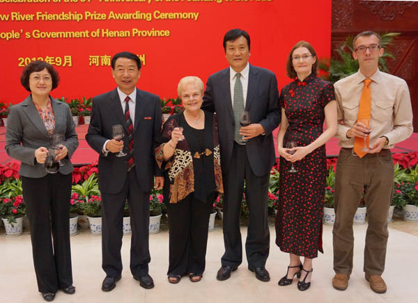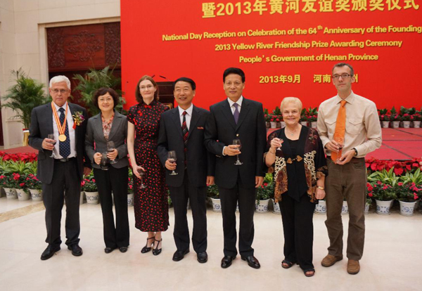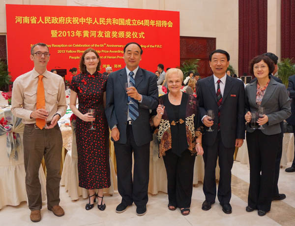 9月29日,河南省人民政府庆祝中华人民共和国成立64周年招待会暨2013年黄河友谊奖颁奖仪式在郑州黄河迎宾馆举行。省委副书记、省长谢伏瞻出席招待会并为“黄河友谊奖”获奖者颁奖。省委副书记邓凯、省军区司令员卢长健、省人大常委会副主任储亚平、副省长赵建才、省政协副主席邓永俭等出席招待会。我校党委书记剧乂文、副校长赵继红以及长期在校工作的外国专家马珍妮(Jane Marcum,首届“黄河友谊奖”获得者)、戴维德(David Christopher)和崂瑞(Lori Christina Enfield)应邀参加了招待会。