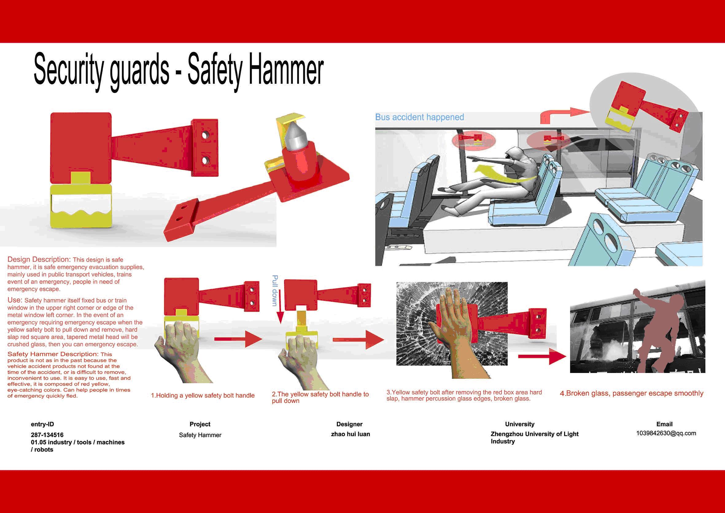 国际教育学院栾兆辉同学作品,崔俊杰、崔晓飞老师指导。设计说明:此款设计是安全锤,是安全紧急逃生用品,主要应用于公交汽车,火车发生紧急事件,帮助人员需要紧急疏散逃离。此款产品简单易操作,使用方便,能够为逃生者赢得更快的逃生时间,减少受伤害的情况。
