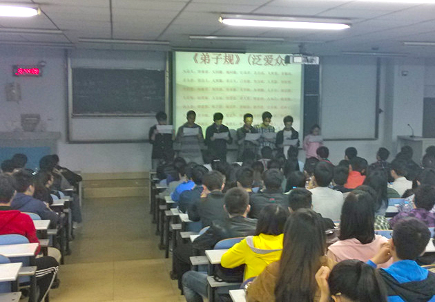 本次讲堂由“唱一首歌曲”、“诵一段经典”、“看一个短片”、“讲一个故事”、“开展一次互动”、“撰写一些心得留言”六个环节组成,现场座无虚席,师生们在这六个“一”中共同感受着道德的力量。