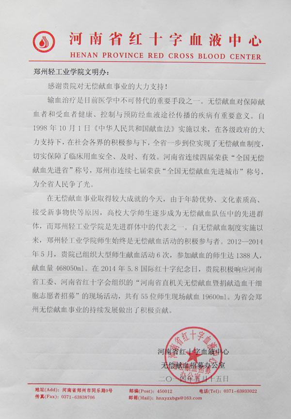 近日,河南省红十字血液中心向我校文明办发来感谢信,感谢我校多年来为郑州市无偿献血事业持续发展做出的积极贡献。