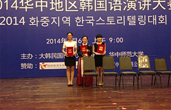 6月6日,2014华中地区韩国语演讲大赛决赛在华中师范大学举行。我校参赛选手勇创佳绩,取得了2个二等奖、1个三等奖的优异成绩,继2013华中地区韩国语演讲大赛后再次展现了我校朝鲜语专业(省级特色专业)的办学实力。