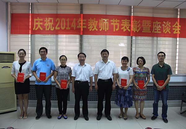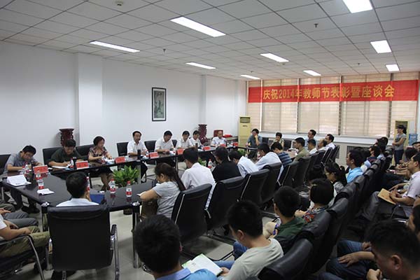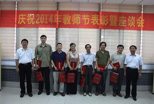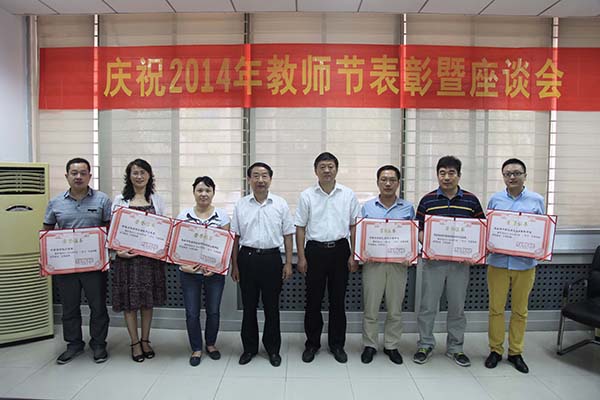 9月10日下午,我校庆祝教师节表彰暨座谈会在东风校区第三会议室召开。校领导剧乂文、石恒真、张胜利、窦效民、龚毅、陈江风、安士伟、李世瑛出席会议。相关职能部门负责人,2012—2014学年度“三育人”先进集体代表、先进个人代表,2014年从事教育工作满30年教职工代表,2014年全国模范教师荣誉称号获得者,全国首届研究生“智慧城市”创意设计大赛一等奖指导教师,2014年第九届全国大学生“飞思卡尔杯”智能汽车竞赛全国二等奖指导教师,2014年度河南省辅导员职业能力大赛一等奖获奖教师,教授、博士代表,离退休教师代表参加了座谈会。党委副书记张胜利主持会议。