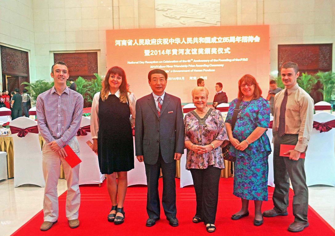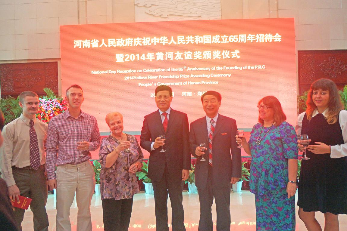 9月29日上午,河南省人民政府庆祝中华人民共和国成立65周年招待会暨2014年“黄河友谊奖”颁奖仪式在郑州黄河迎宾馆举行。省委副书记、省长谢伏瞻出席招待会并为“黄河友谊奖”获奖者颁奖。省领导赵素萍、卢长健、储亚平、王艳玲、邓永俭出席招待会。我校党委书记剧乂文以及长期在校工作的外国专家马珍妮(首届“黄河友谊奖”获得者)、戴维德、梅根、塞西莉亚和约书亚应邀参加了招待会。