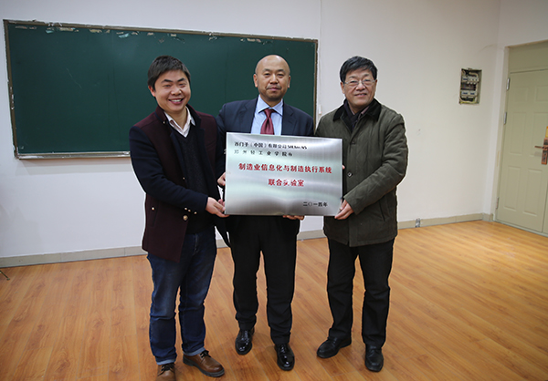 副校长龚毅教授和西门子工业软件公司MES总经理戚锋博士出席了共建协议签署与挂牌仪式。西门子(中国)有限公司行业大客户经理李琳利、设备处和机电工程学院相关负责人以及机电工程学院部分骨干教师、研究生等参加了活动。