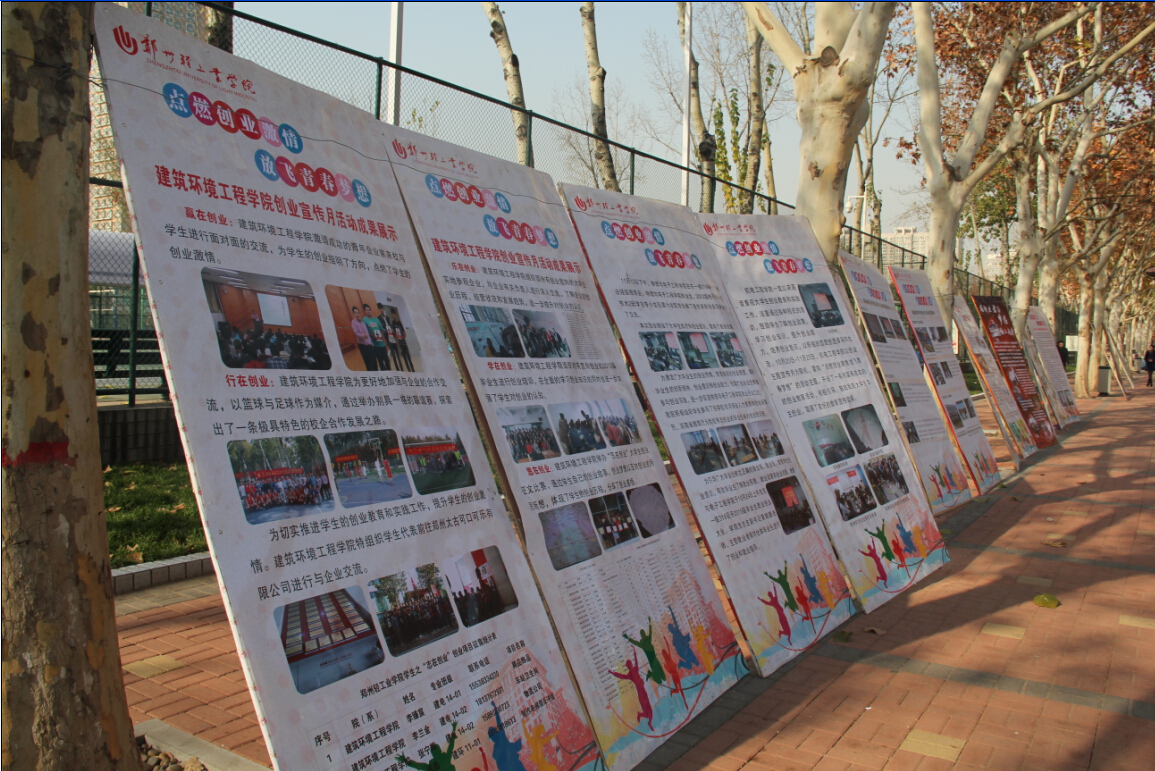 “赢在创业”企业家论坛上,学校邀请企业家来校与学生进行面对面的交流,分享企业家的创业历程和心得体会。“行在创业”创业校友沙龙中,学校邀请近几年毕业的自主创业校友,畅谈他们读大学期间以及毕业后的创业故事,与在校学生面对面交流创业经验,使学生充分感受优秀校友的奋斗历程,激发他们的创业意识,对学生产生了榜样示范的作用。在“乐在创业”创业见习直通车活动中,学校组织300余名有创业意向的大学生实地参观了河南省国家大学科技园、郑州市金水区大学生创业园,与创业园和企业有关负责人深入交流,了解企业的创业历程、经营状况和发展趋势,进一步提升了对创业的认识。在“志在创业”大学生自主创业项目征集活动中,征集64个创业项目,学校后续将择优进行培育和支持,推荐一些具有较好市场前景和发展潜力的项目入驻创业园。在“学在创业”大学生创业培训中,共对970名2015届毕业生进行了创业培训。在“思在创业”大学生创业征文比赛中,各院(系)共推荐了125篇创业论文,最后评选出39篇优秀论文。