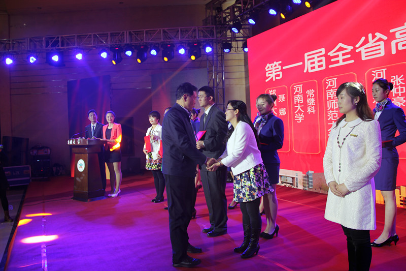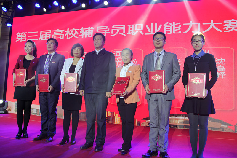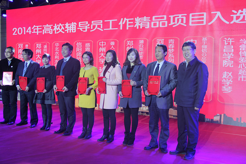 中国工程院院士、郑州大学校长刘炯天为10个2014年全省高校辅导员工作精品项目(资助类)颁奖,我校的《蒲公英使者——项目化朋辈辅导模式》获奖,并作为精品项目代表作典型展示,现场播放了项目宣传片《蒲公英的梦》。省委高校工委副书记、省教育厅副厅长张亚伟为河南省第三届高校辅导员职业能力大赛获奖选手颁奖,我校计算机与通讯工程学院辅导员沈高峰获得一等奖。