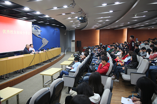 座谈结束后,吴永辉校友、贾国忠校友为在校学生做了一场精彩的创业讲座。他们结合自身的创业历程,分享了创业的经验和创业者应该具备的素质,并与现场同学进行了热烈的交流和讨论。