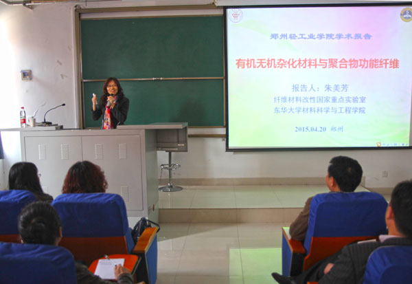 4月20日,应材料与化学工程学院邀请,国家杰出青年科学基金获得者、长江学者特聘教授、东华大学材料科学与工程学院院长朱美芳教授来我校进行学术交流,并为相关专业师生作了题为“有机/无机杂化材料及其功能纤维”的学术报告。报告会由材料与化学工程学院院长方少明教授主持。