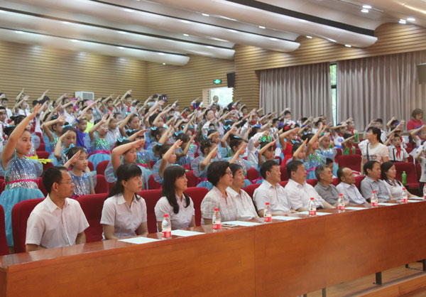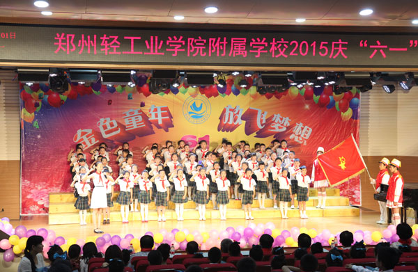 演出开始前,举行了庄严的新队员入队仪式。在鲜艳的少先队队旗下,出席活动的学校领导与高年级少先队员一起,为新入队的小队员们带上了崭新的红领巾,勉励他们好好学习、快乐成长。王新杰副校长代表学校向小朋友及辛勤耕耘的老师们致以节日的问候,并对孩子们的成长提出了殷切希望。